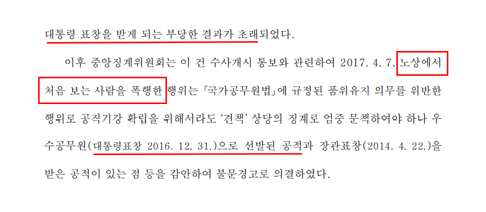 아니다. 2017년 4월 7일 중앙징계위원회가 A 행위를 “견책 상당 징계로 엄중 문책해야” 한다고 봤음에도 “(2016년) 우수 공무원으로 선발된 공적과 (2014년) 장관 표창을 받은 공적이 있는 점 등을 감안해 불문경고로 의결”했다. 잘못을 캐묻거나 꾸짖지 않고 앞으로 조심하고 삼가도록 주의를 주고 만 것.