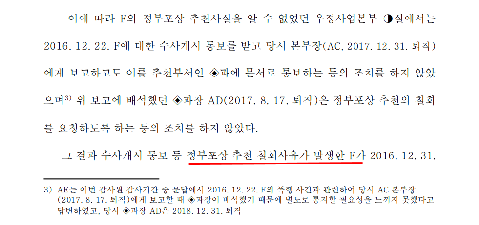 운영지원과장은 감사원 감사가 시작되기 14일 전인 2018년 12월 31일 퇴직했다. “(운영지원과장) 본인은 (감사담당관실로부터 수사 개시 알림을) 받았다고 인정했다”는 증언이 있었지만 따로 확인하거나 책임을 물을 수 없게 된 것.